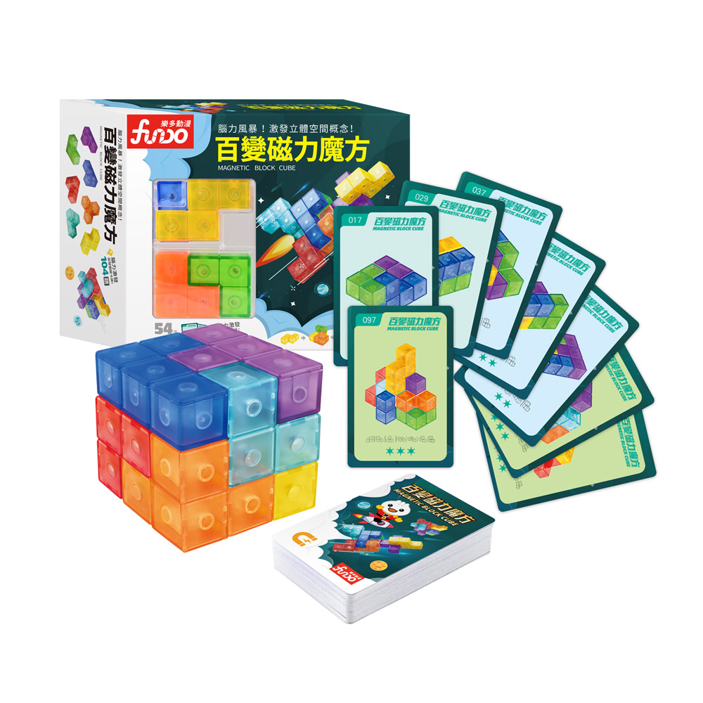 7種造型水晶磁力魔方、54張104題益智圖解卡牌